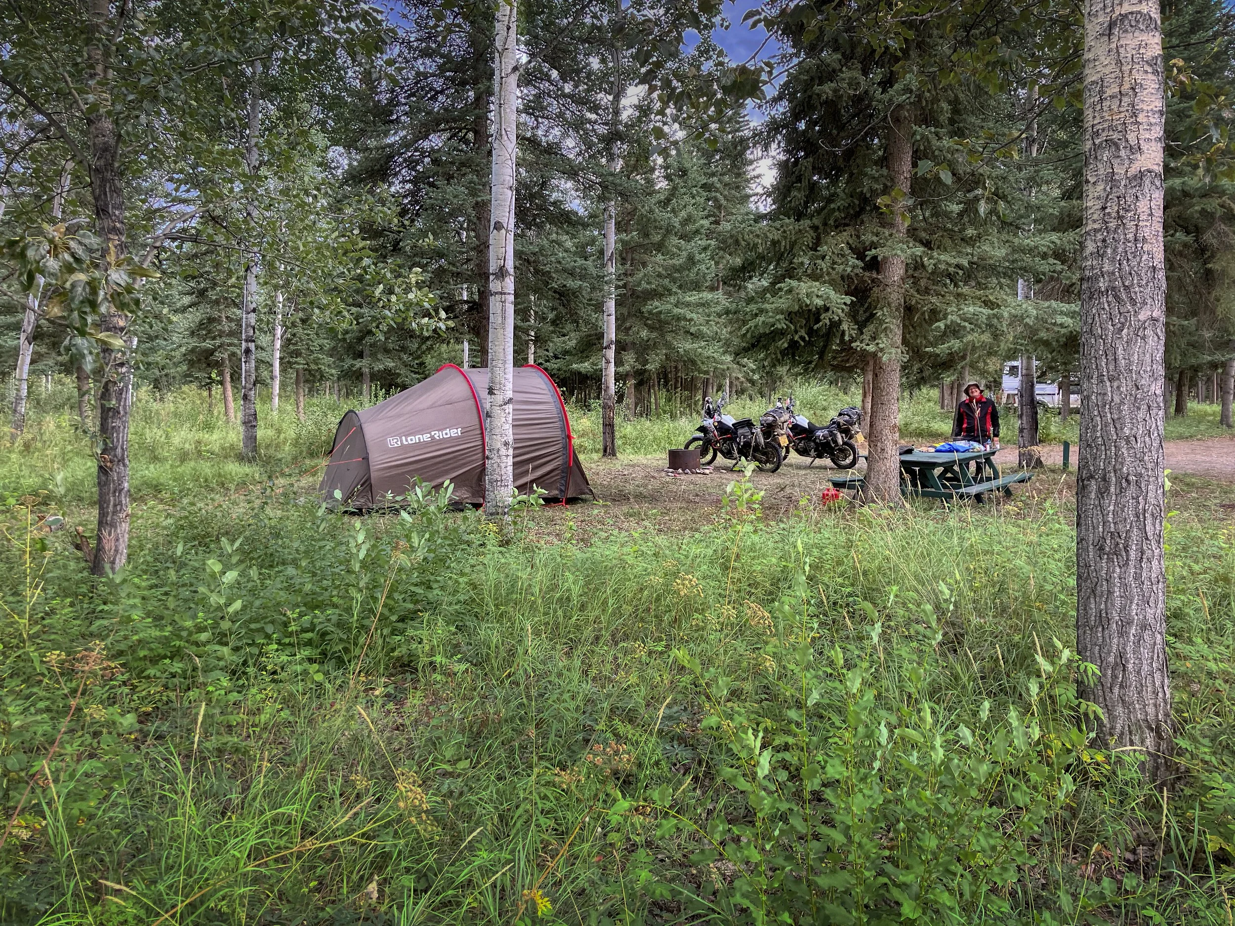 As we neared Dawson City, the descent steepened yet the roads remained wet and slippery. At times, we were in 1st gear and using the engine-braking and rear brake to control the descent. Finally we reached the bottom and pulled up just before the Dawson City ferry. We decided not to cross tonight and instead, chose to look in the campsite beside the river. It was busy and we couldn’t get a spot by the river. Instead, we rose a couple of tiers and found a ‘group’ site with bear-boxes - a quiet pitch off the main drag. Or so we thought. The RV in the pitch two down obviously had poor leisure batteries as the generator seemed to run non-stop, until 8pm that is.