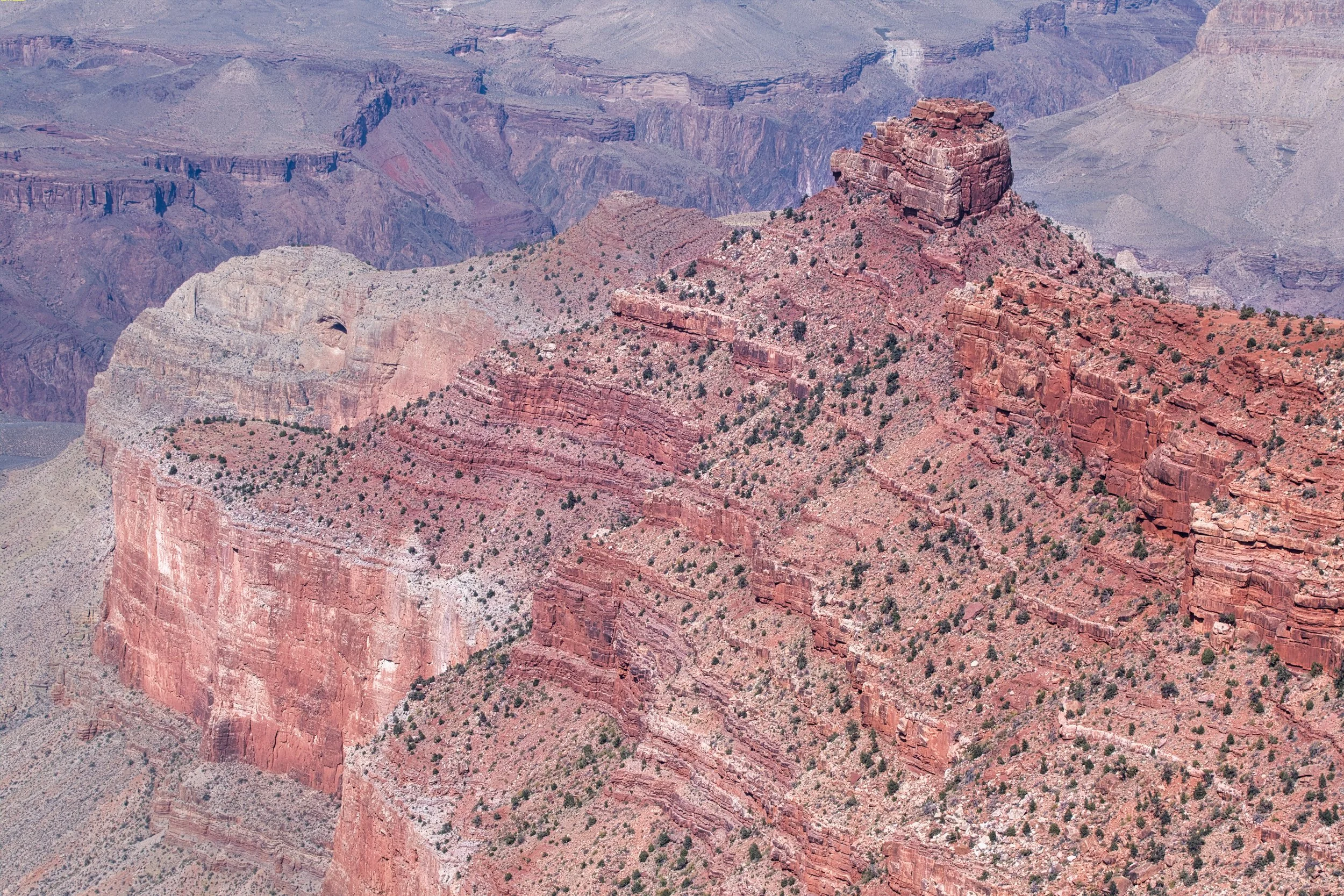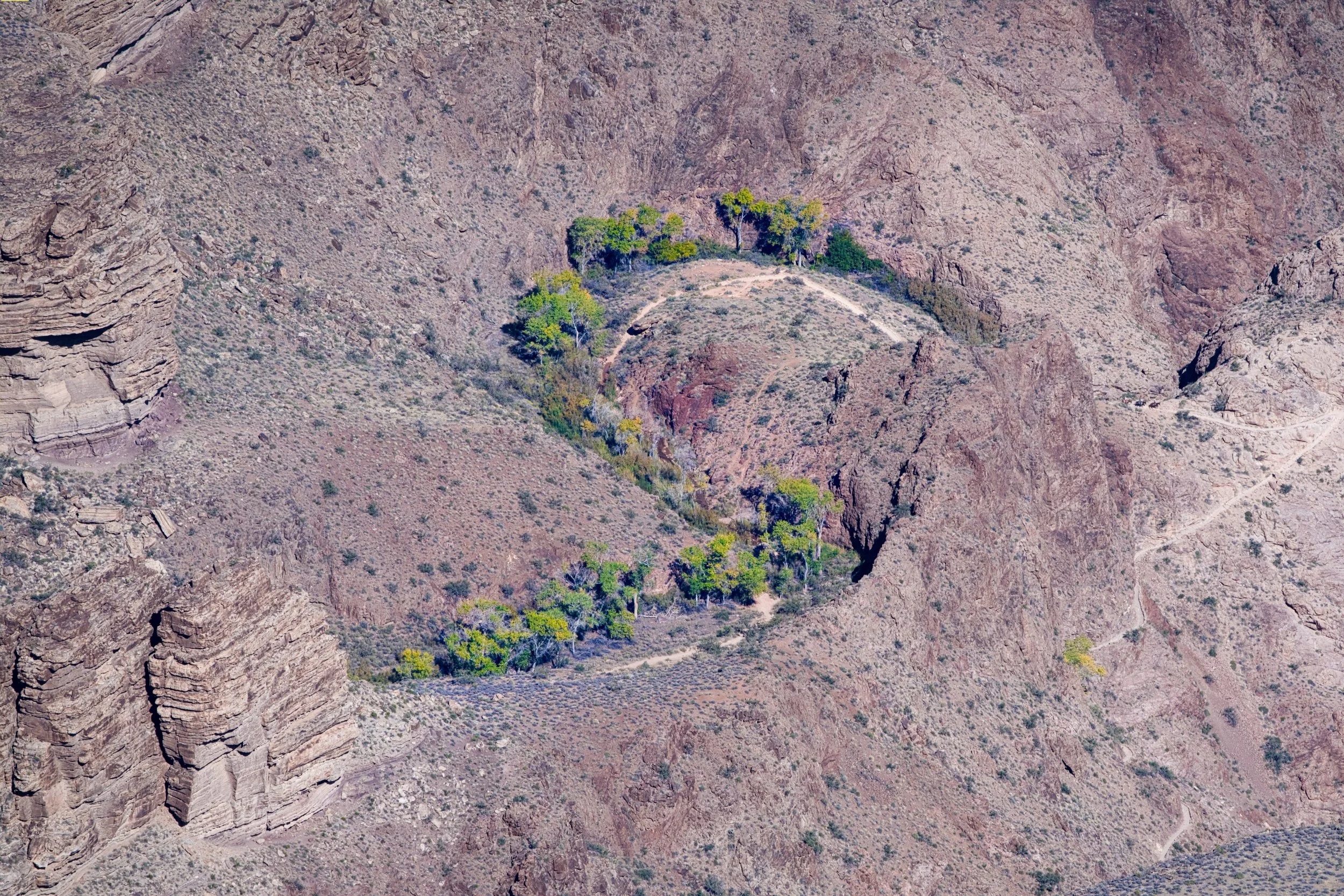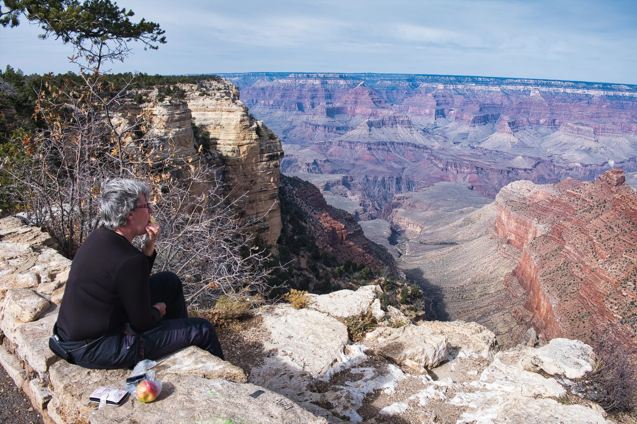 As we rode along the main road of the South Rim toward the Desert View Watchtower, there were numerous lay-bys and viewpoints at which we had to stop and try to absorb the magnificence and the magnitude of the changing views before our eyes. At one such place we sat on the wall with our feet dangling over the edge, eating our meagre lunch. A minibus pulled in behind us with just a few people on board. It became apparent they were on a guided tour and we listened in on the conversation, occasionally asking our own questions. The guide had produced a telescope, on a tripod, and had been showing his guests the people on the trail that led to the bridge at the bottom. As he invited us to take a look and truly understand the scale of the nearby cliffs and peaks, he told us of the trail that is approximately 27 miles in length, that takes you from one rim to the other. It is not recommended to complete in one day, as the increased temperature in the bottom easily leads to heat exhaustion.