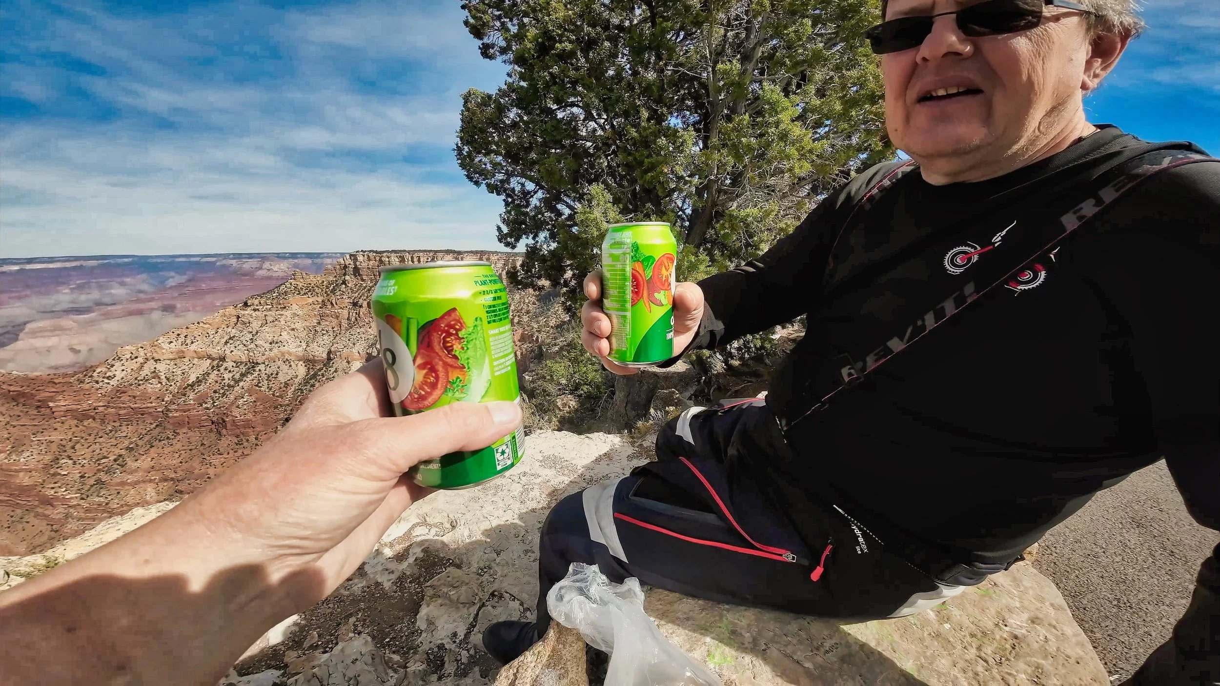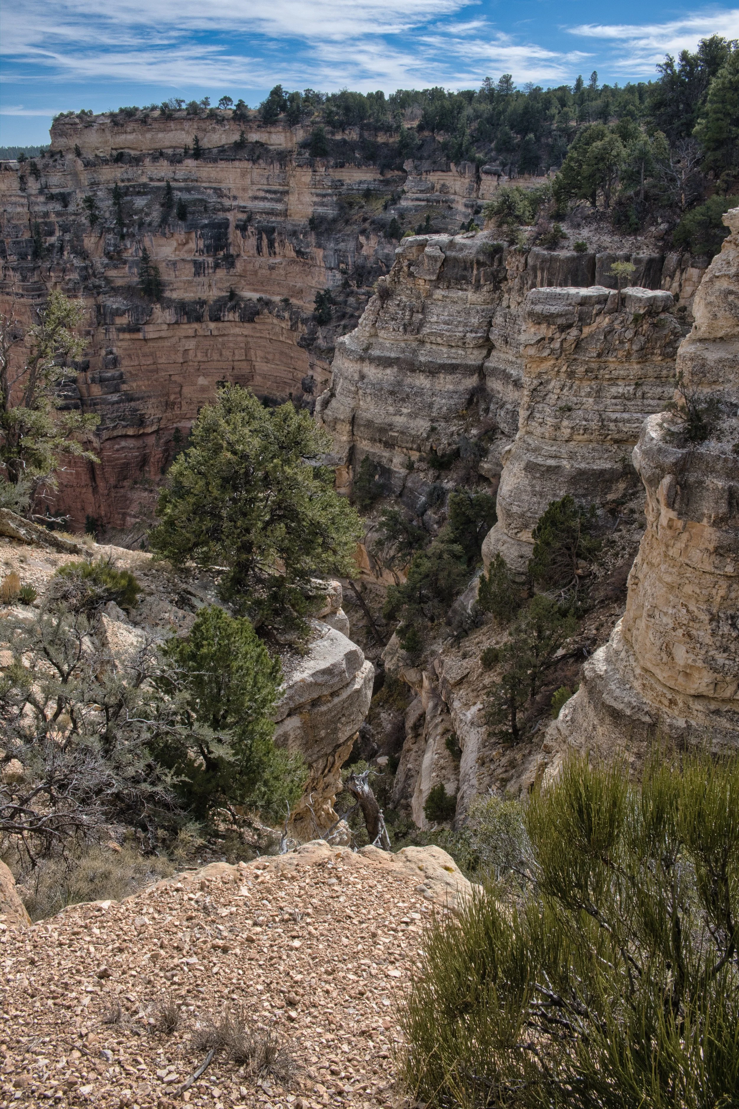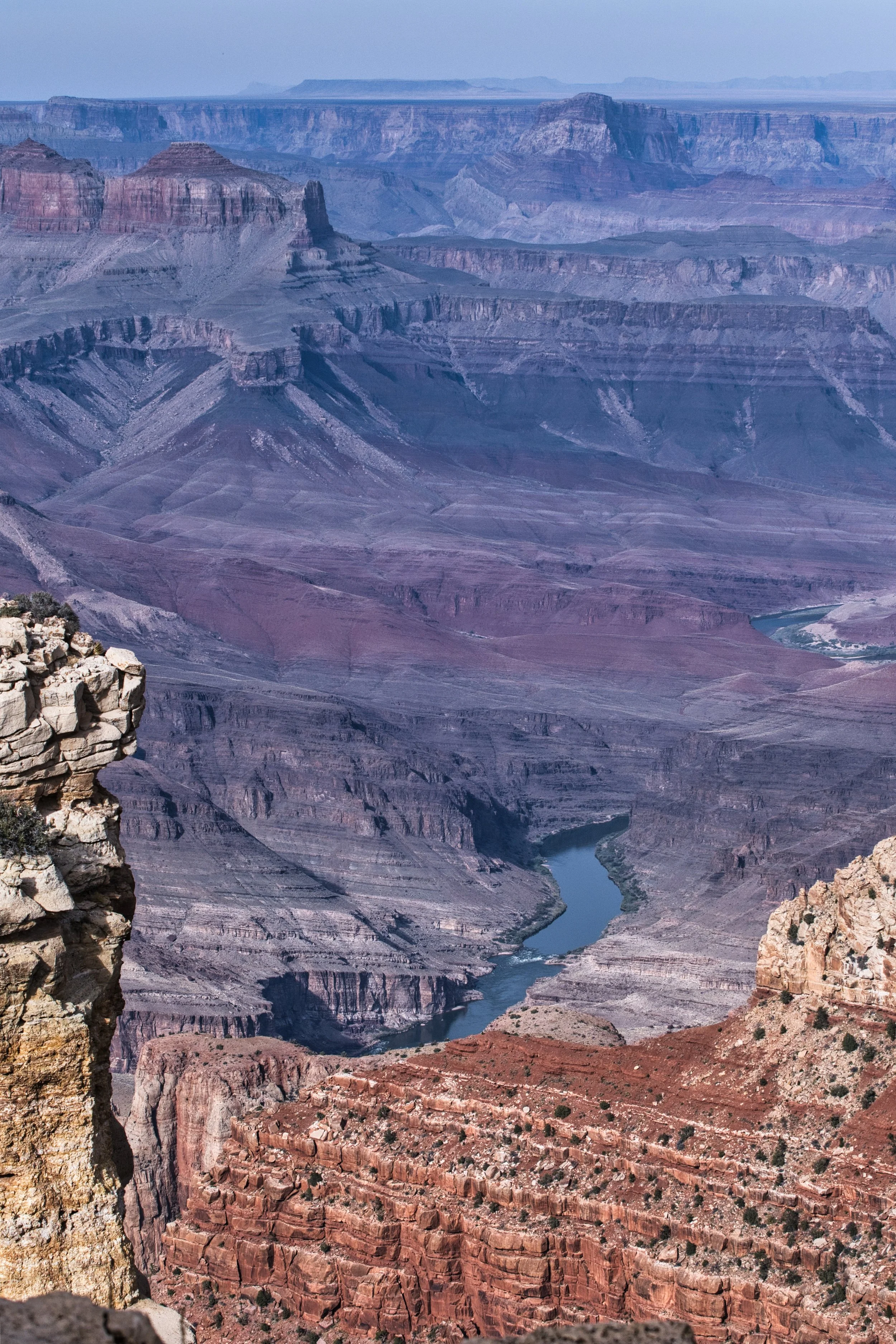 As we rode along the main road of the South Rim toward the Desert View Watchtower, there were numerous lay-bys and viewpoints at which we had to stop and try to absorb the magnificence and the magnitude of the changing views before our eyes. At one such place we sat on the wall with our feet dangling over the edge, eating our meagre lunch. A minibus pulled in behind us with just a few people on board. It became apparent they were on a guided tour and we listened in on the conversation, occasionally asking our own questions. The guide had produced a telescope, on a tripod, and had been showing his guests the people on the trail that led to the bridge at the bottom. As he invited us to take a look and truly understand the scale of the nearby cliffs and peaks, he told us of the trail that is approximately 27 miles in length, that takes you from one rim to the other. It is not recommended to complete in one day, as the increased temperature in the bottom easily leads to heat exhaustion.
